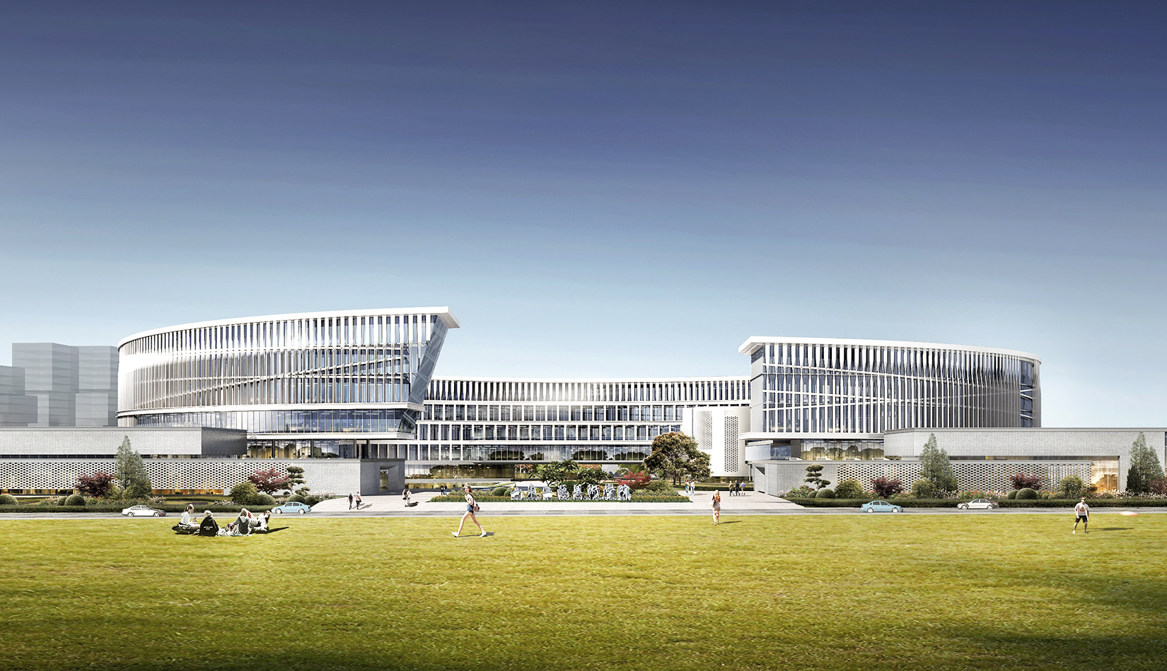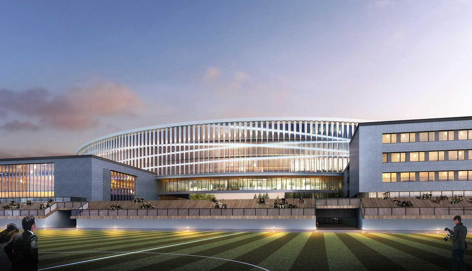 建筑方形體量運用魯班鎖的本質(zhì)——榫卯結(jié)構(gòu),進行體塊塑造,將這種天人合一的工匠精神貫穿整個校園。立面材質(zhì)上,采用石材及具有中國古典韻味的磚幕墻,體現(xiàn)學(xué)校厚重的文化底蘊?!棒敯嗑€”交織在教學(xué)綜合體所在的圓形體塊上,利用動感流線型的線條,使建筑更具有藝術(shù)氣息。