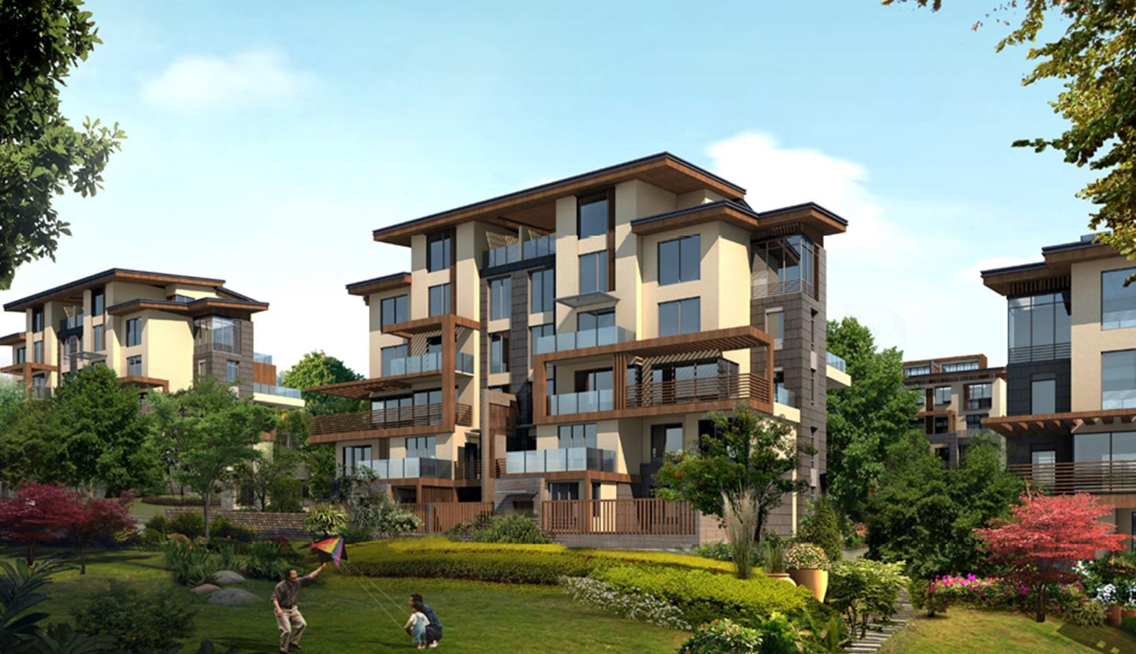 與北部組團(tuán)形成對比,南面的地塊引入了一系列的圍合式院落布局。建筑物圍繞組團(tuán)中心花園布局。不同的花園有不同的植物和水景主題,統(tǒng)一中包含個(gè)性。