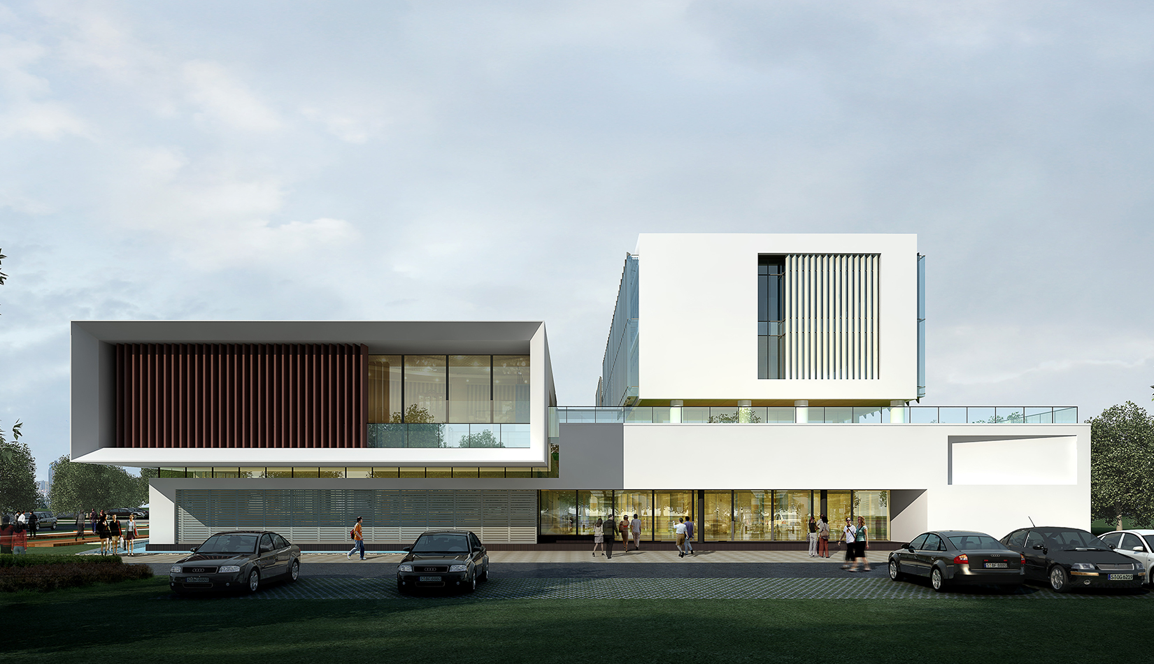 作為中韓貿(mào)易合作區(qū)一期啟動區(qū)的重點項目,其承擔(dān)著對外展示以及為后續(xù)發(fā)展提供服務(wù)平臺的功能。因此設(shè)計力求穩(wěn)重大氣,以4 層的體量打造出地標(biāo)性的建筑。設(shè)計運(yùn)用簡潔的外形、寧靜的色彩,外立面以白色涂料和木格柵為主,尊重自然,打造一種平和寧靜的感覺。在空間設(shè)計上通過共享空間、上人露臺和一層大平臺,創(chuàng)造出舒適宜人的工作環(huán)境;在技術(shù)上通過地源熱泵、呼吸式幕墻、雨水收集等的應(yīng)用,實現(xiàn)建筑的綠色節(jié)能環(huán)保。