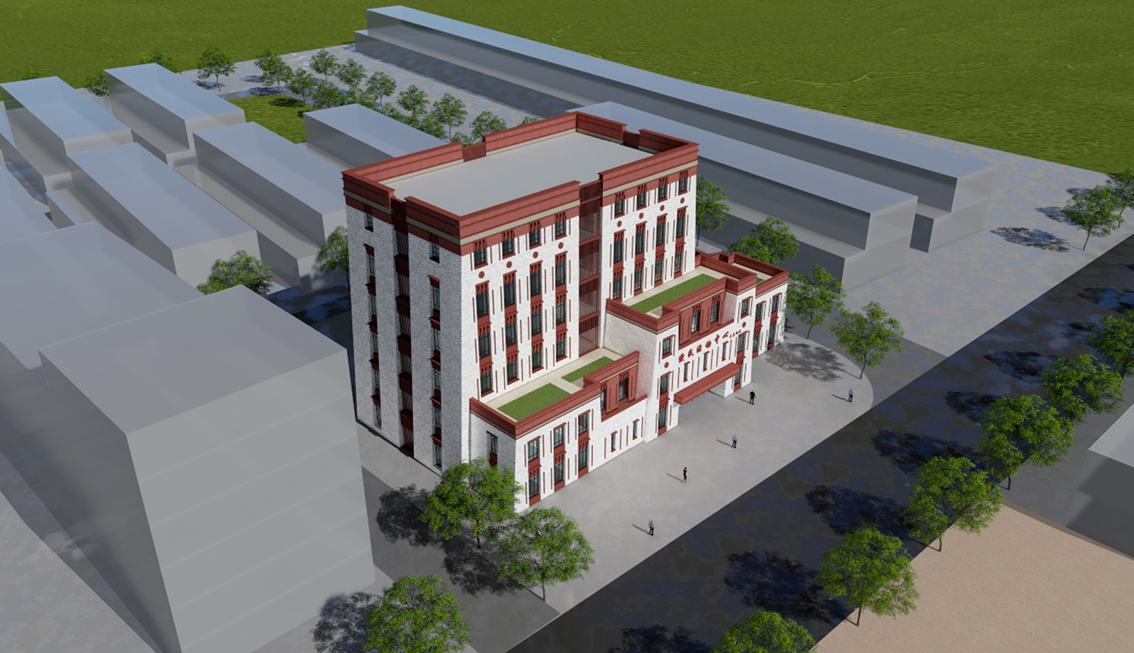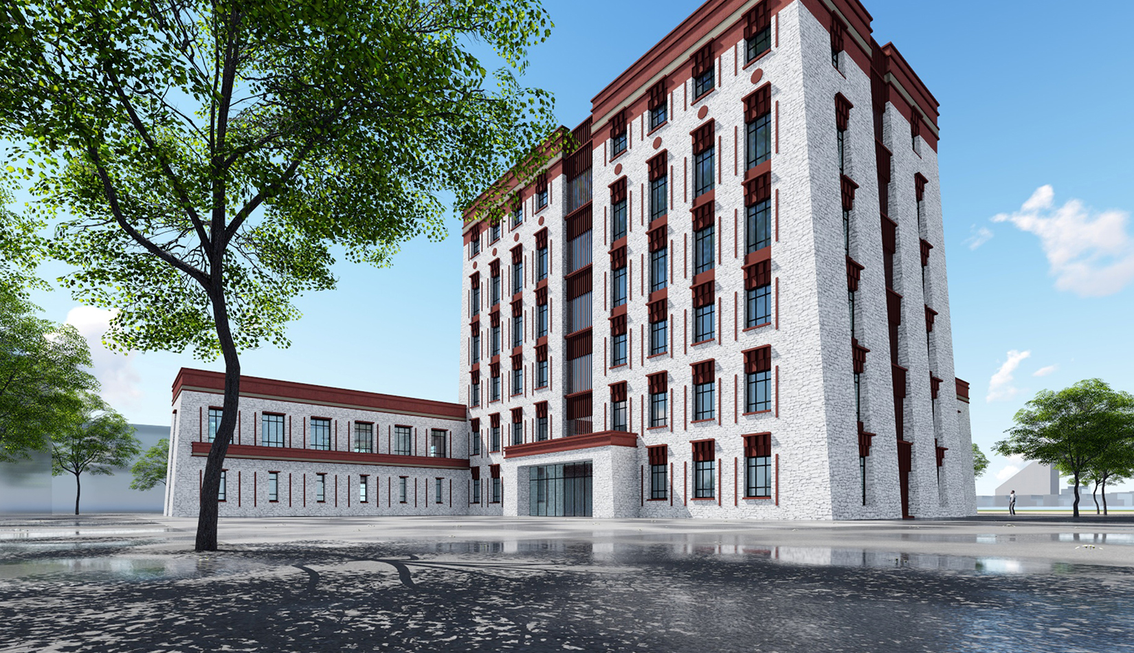 立面采用傳統(tǒng)藏式建筑風(fēng)格,外墻以白色為主,門廊檐下紅、黃、綠、藍(lán)原色艷麗彩畫。藏建筑門邊、窗邊飾有黑色上小下大的邊框,寓意為“牛角”,傳說(shuō)能給人帶來(lái)吉祥。簡(jiǎn)練、概括的藝術(shù)形象,裝飾性極強(qiáng)。